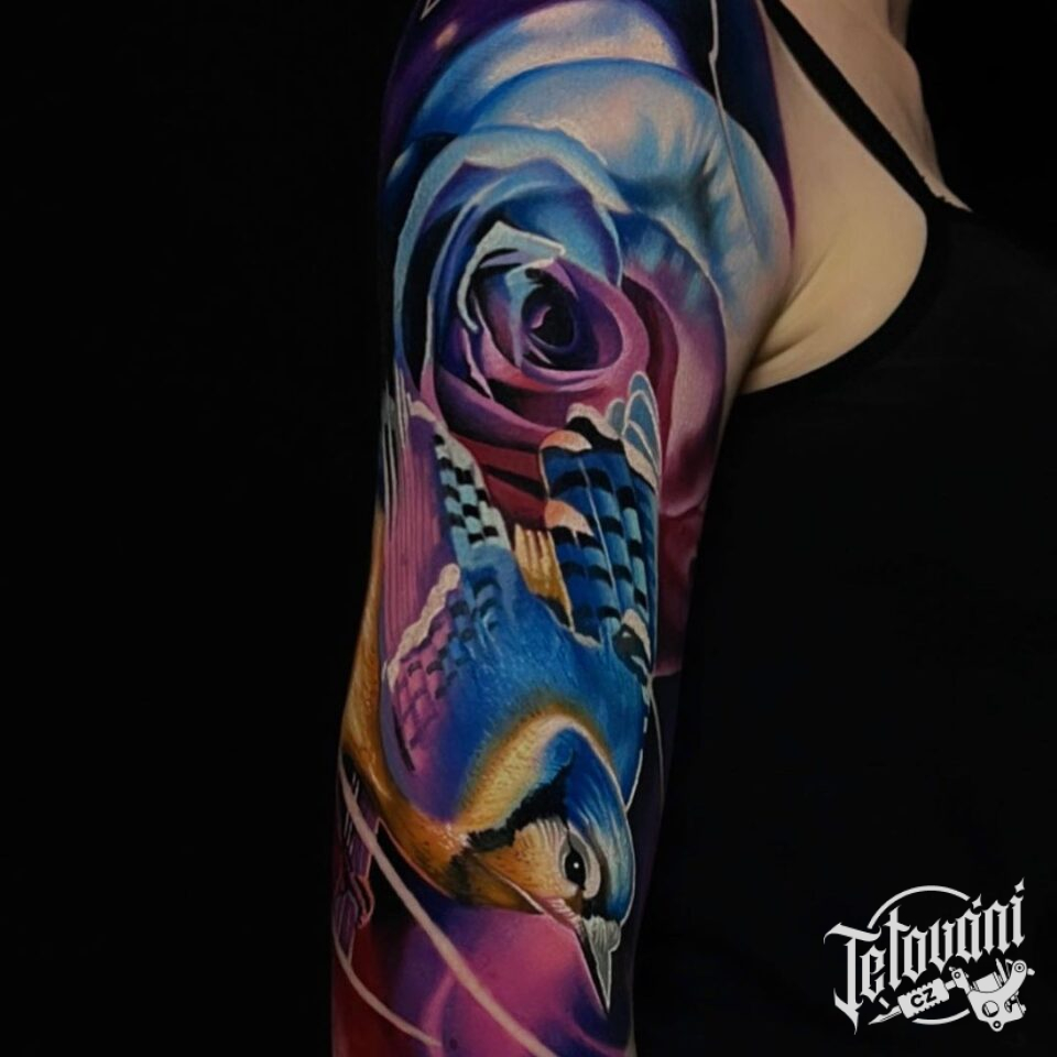Tetování květina růže a zvíře pták na paži