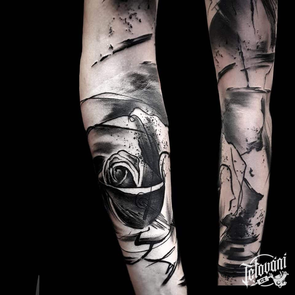 Tetování květina, růže, čáry, rukáv