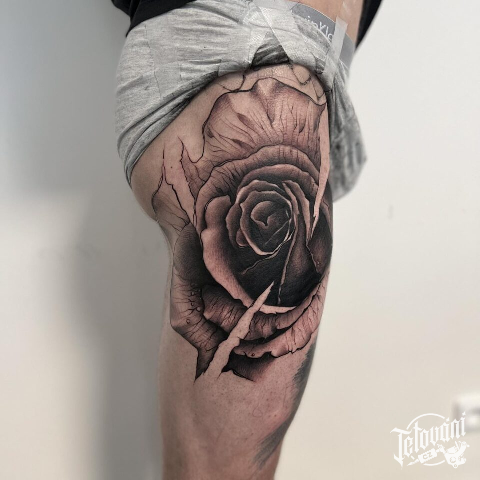 Tetování květina, růže na boku stehna