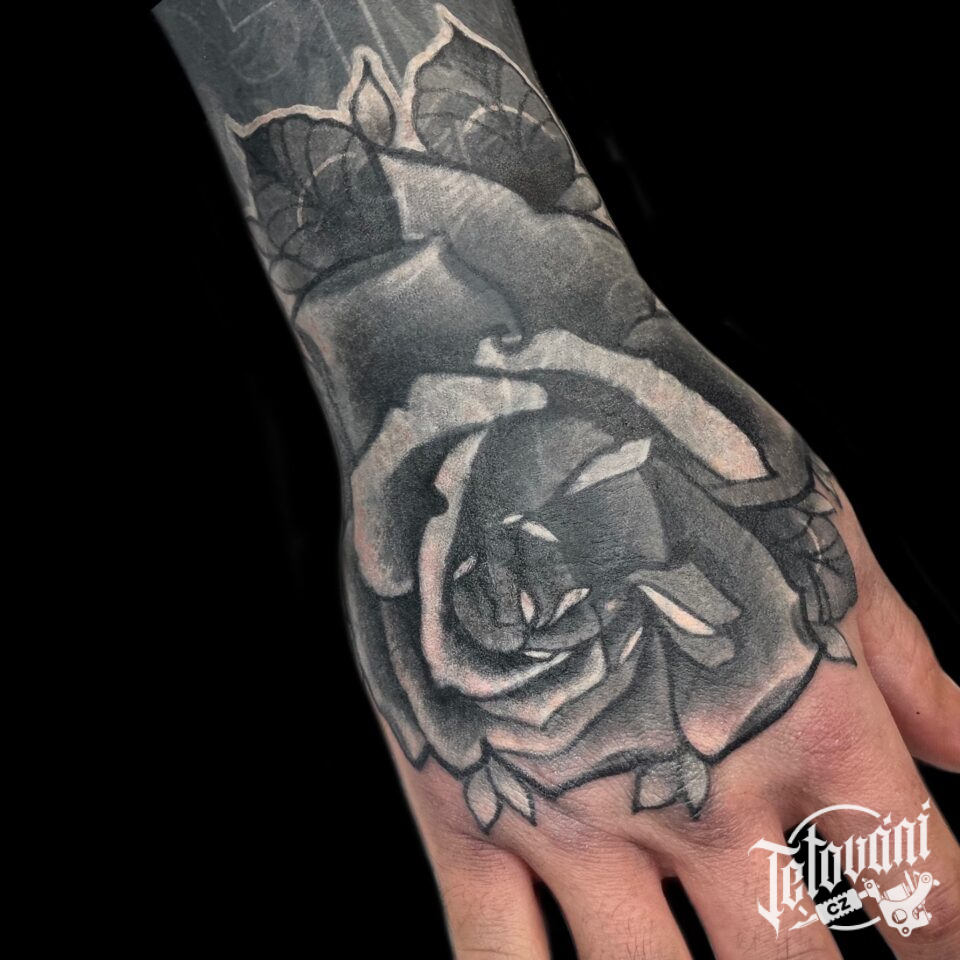 Tetování květina růže na hřbet ruky