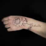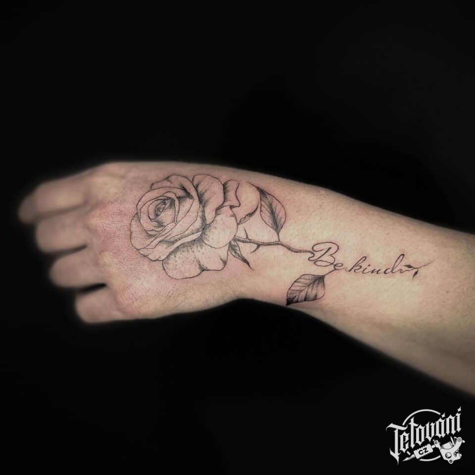Tetování květina růže, nápis na hřbet ruky