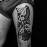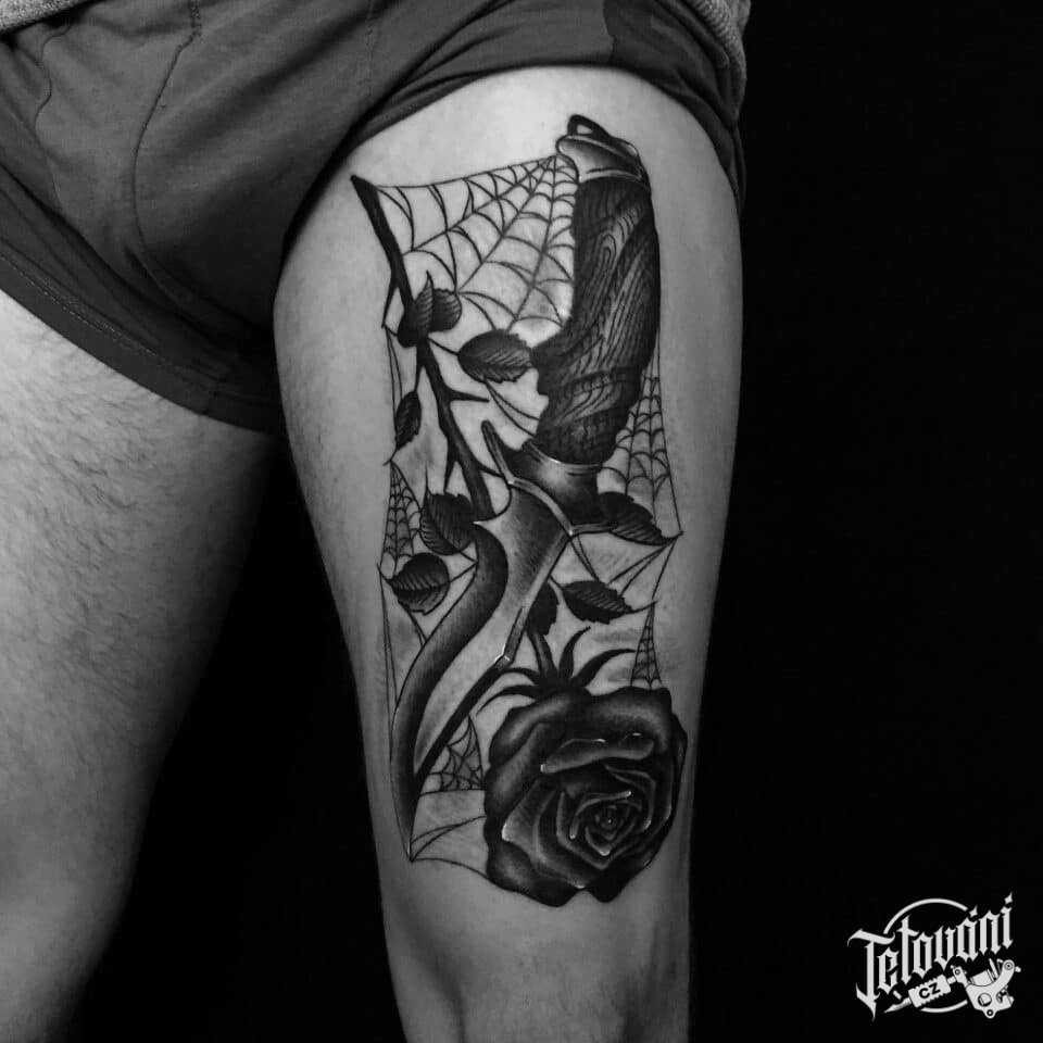 Tetování květina růže, nůž, symbol, pavučina na stehno