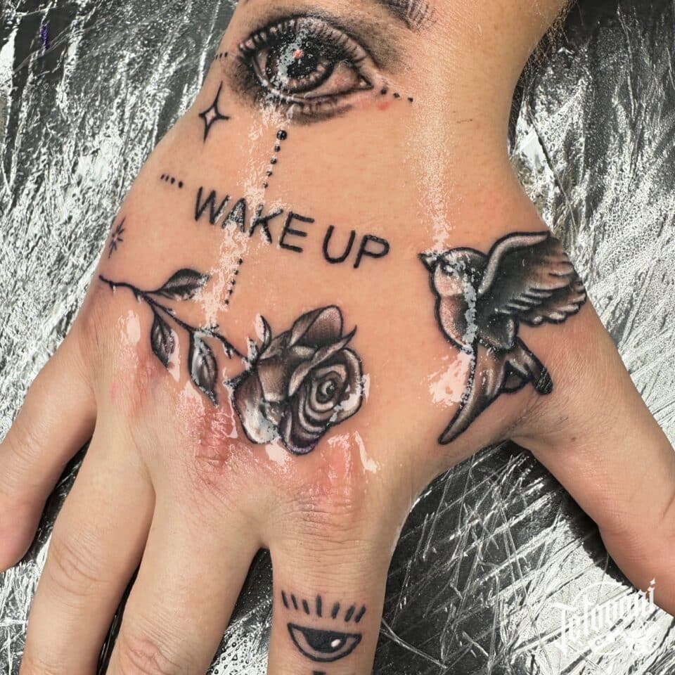 Tetování květina růže, oko, zvíře pták na hřbet ruky