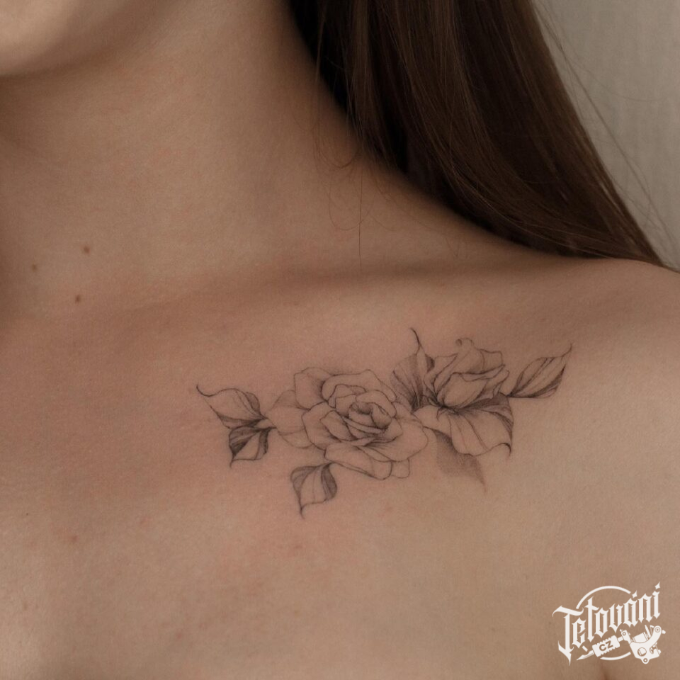 Tetování květina, růže pod klíční kost