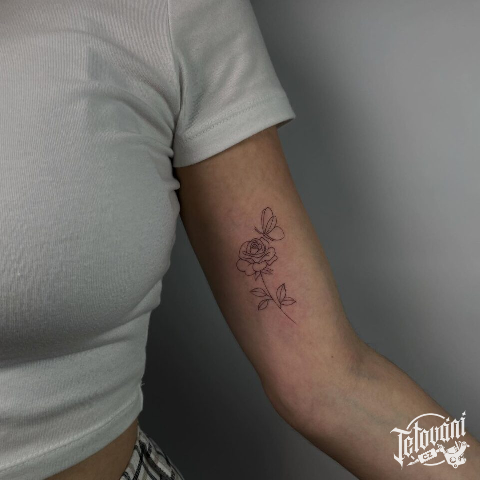 Tetování květina, růže s motýlkem na paži