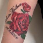 Tetování květina růže se jmény a datumem, nápisy na předloktí