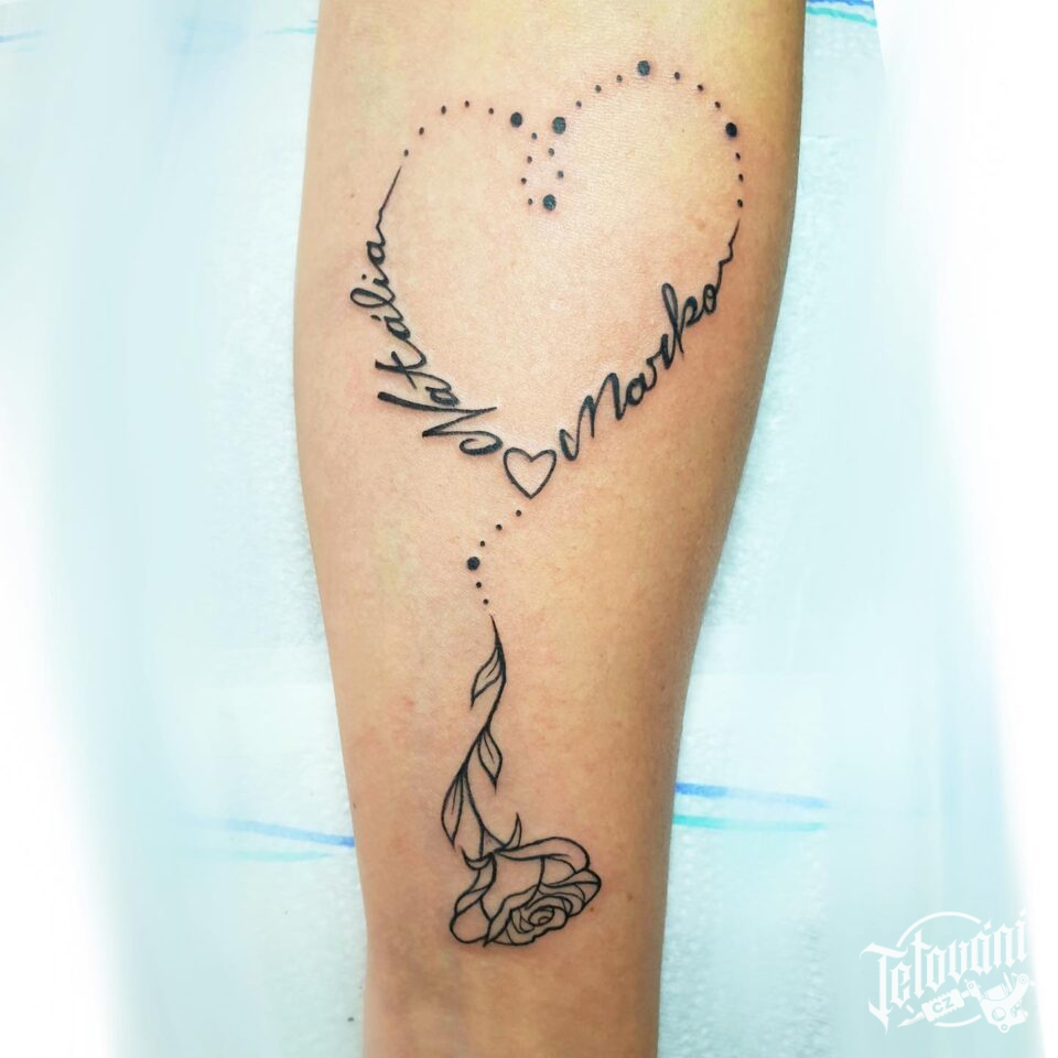 Tetování květina růže, srdce se jmény, symbol rodiny na lýtko