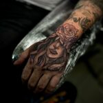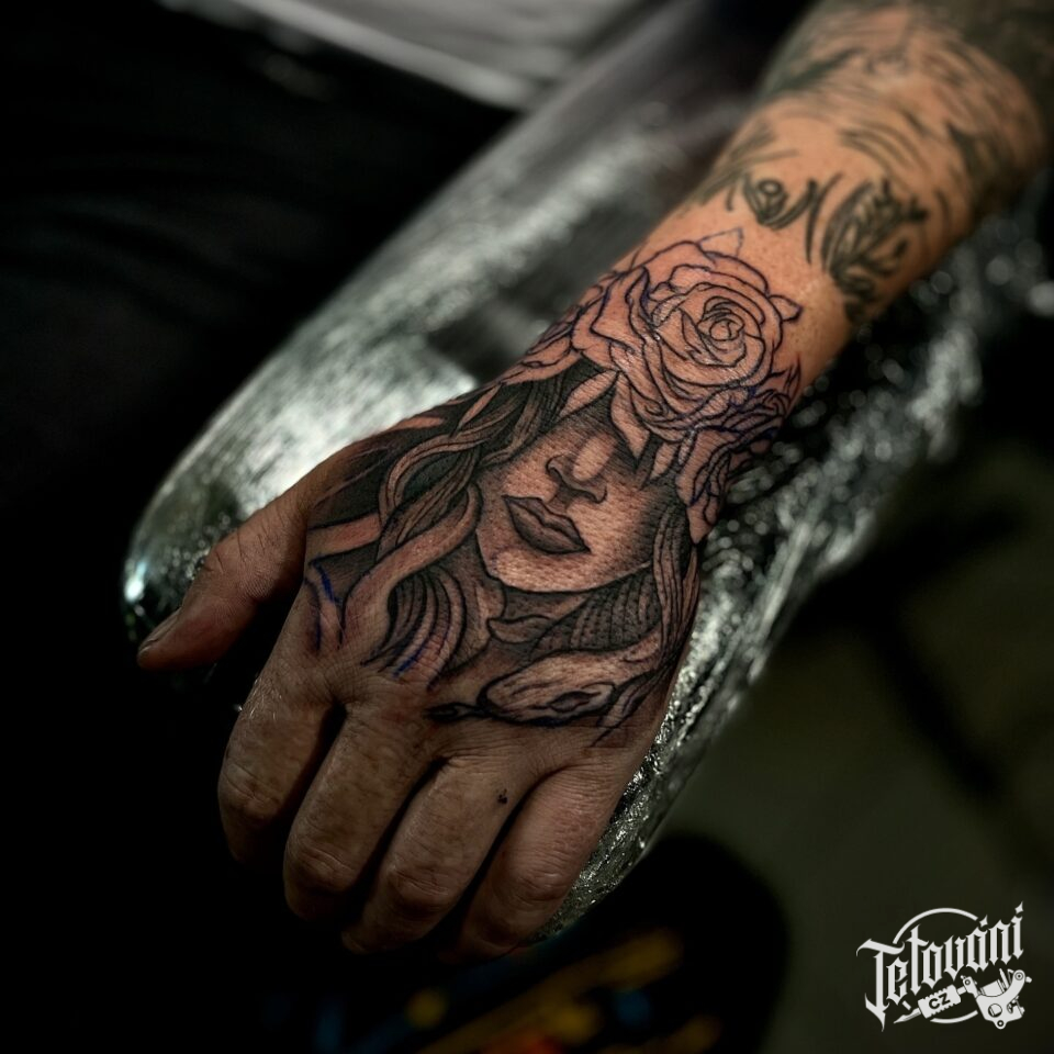 Tetování květina, růže, žena na hřbet ruky