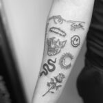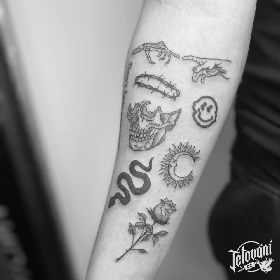 Tetování květina, růže , zvířata, had, lebka, měsíc a znaky a symboly na předloktí