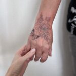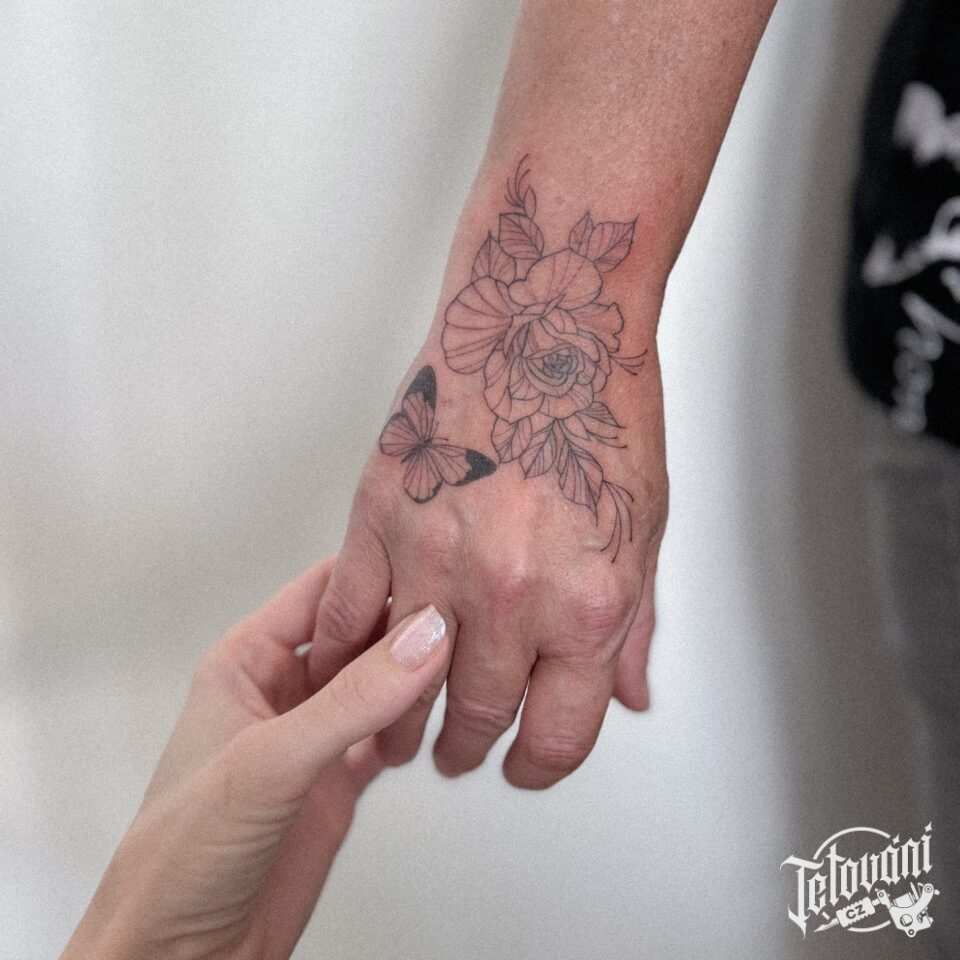 Tetování květina s motýlkem na hřbetu ruky