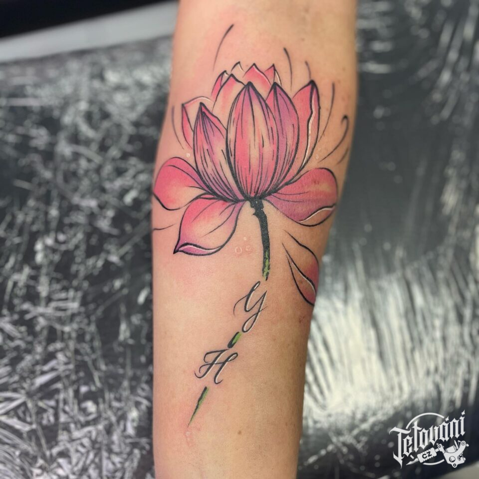 Tetování květina s písmeny na předloktí