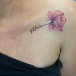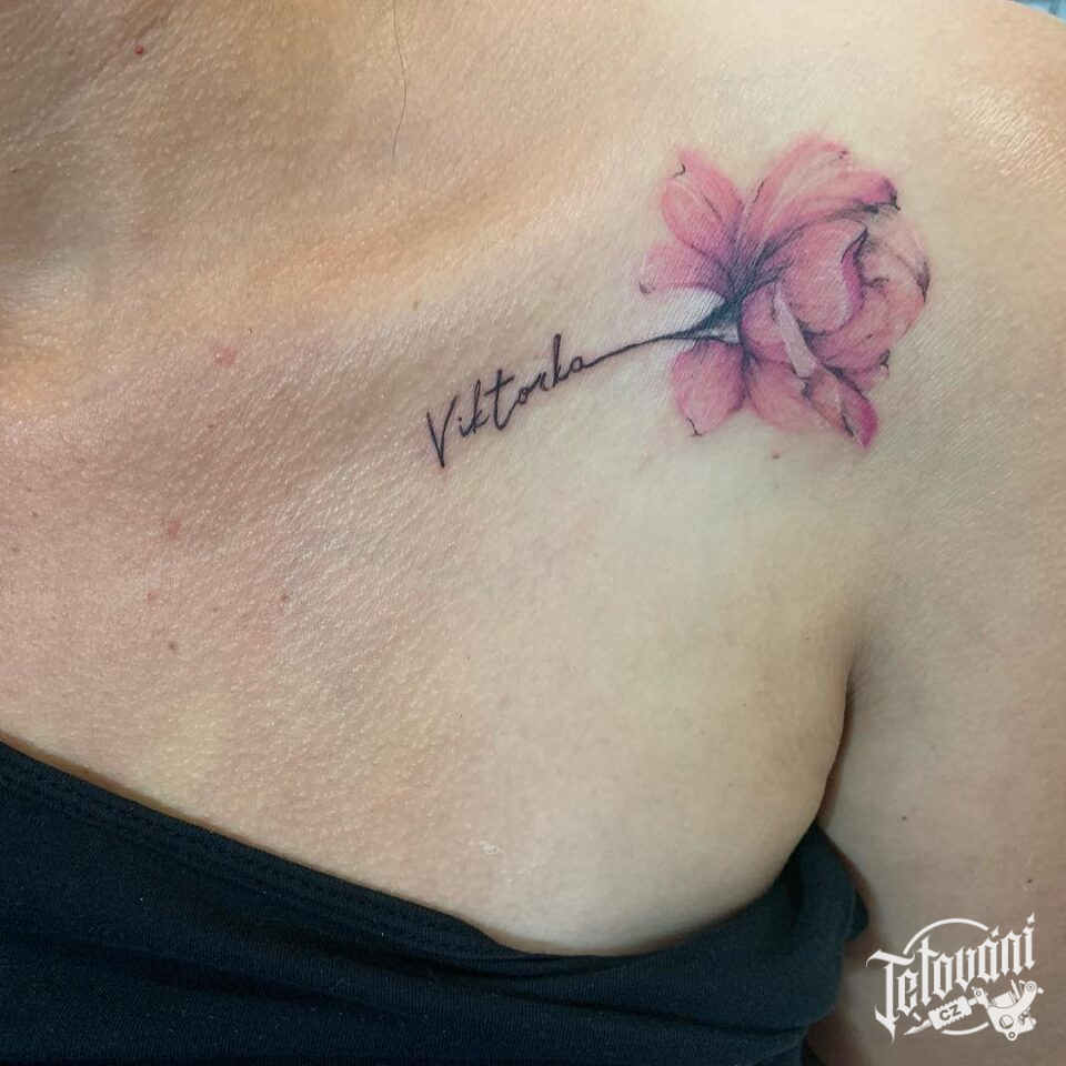 Tetování květina se jménem pod klíční kostí