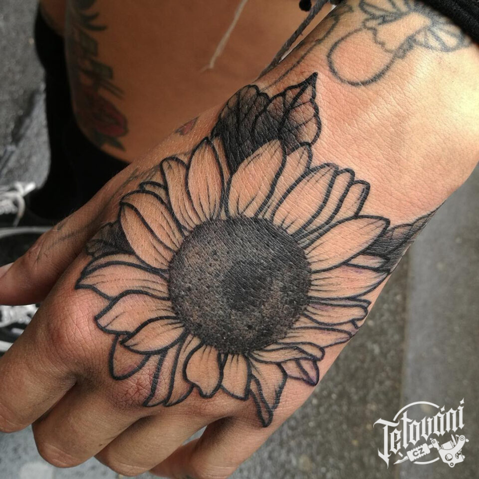 Tetování květina, slunečnice na hřbet ruky
