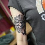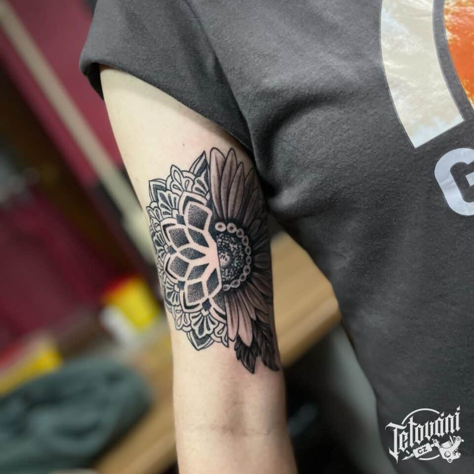 Tetování květina, slunečnice s mandalou na paži