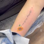 Tetování květina, slunečnice s nápisem na předloktí