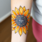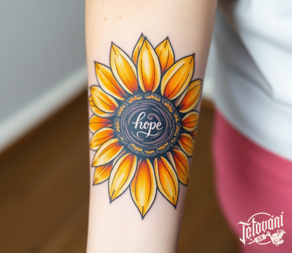 Tetování květina slunečnice, znaky a symboly symbol naděje a nápis na předloktí
