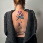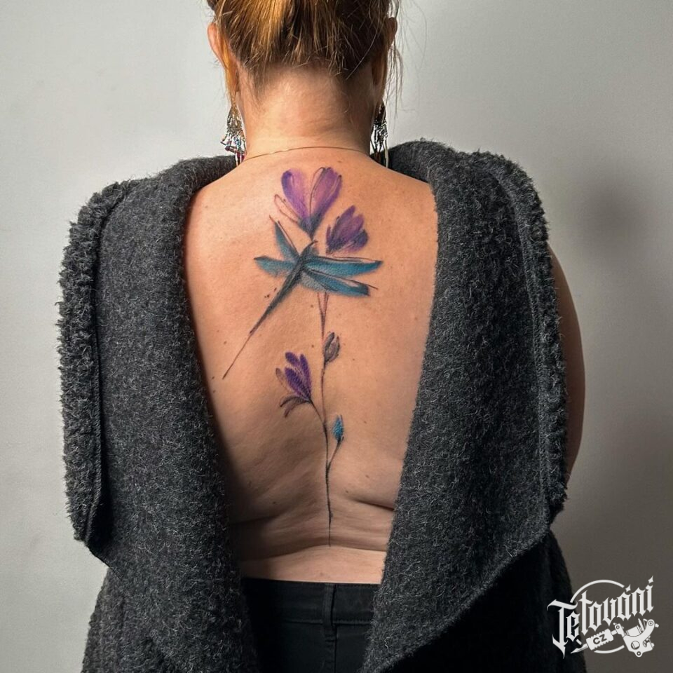 Tetování květina, symbol, vážka na pátěř