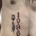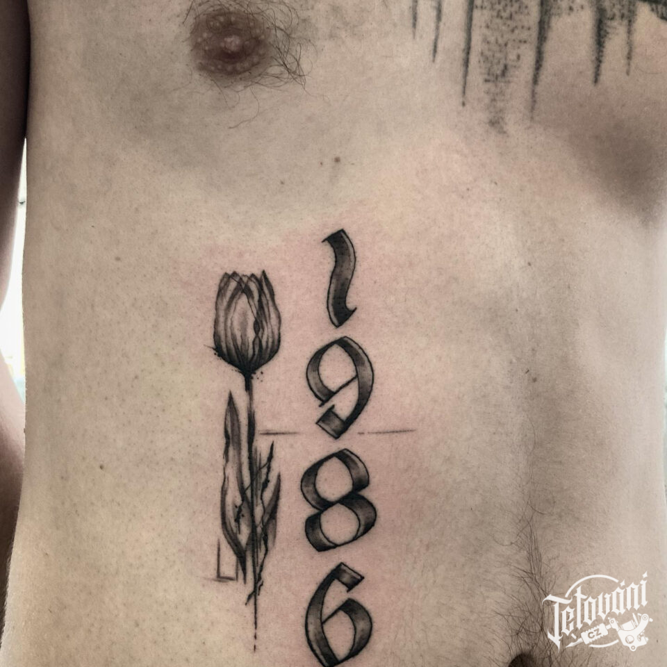Tetování květina, tulipán, nápis, datum, čísla na břichu