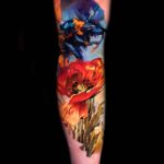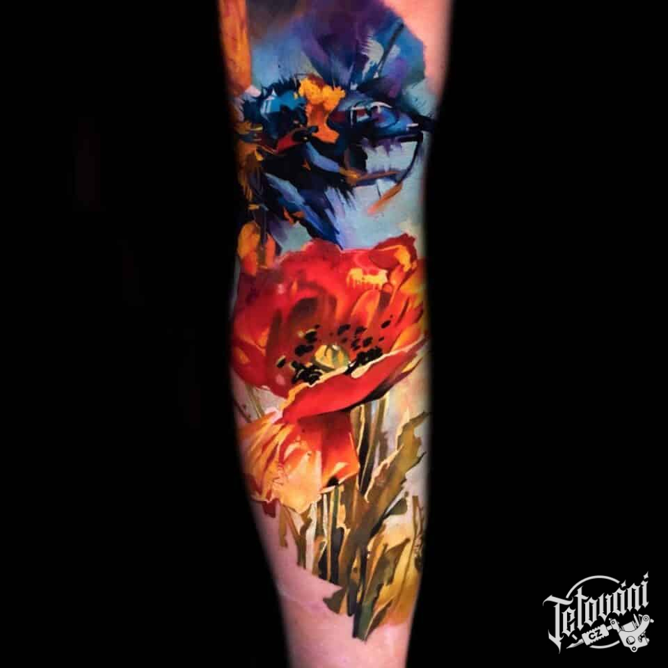 Tetování květina, vlčí mák a zvířata, včela na předloktí