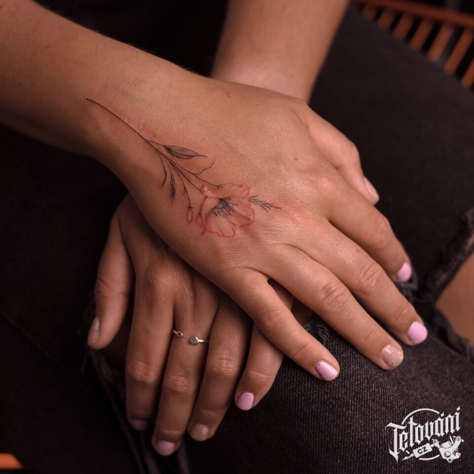 Tetování květina, vlčí mák na hřbetu ruky