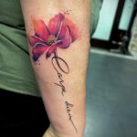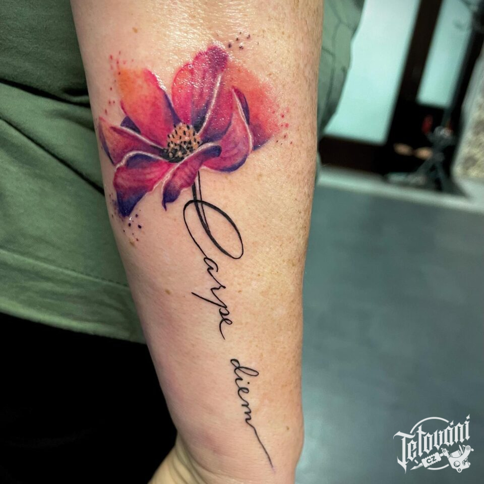 Tetování květina, vlčí mák s nápisem na předloktí