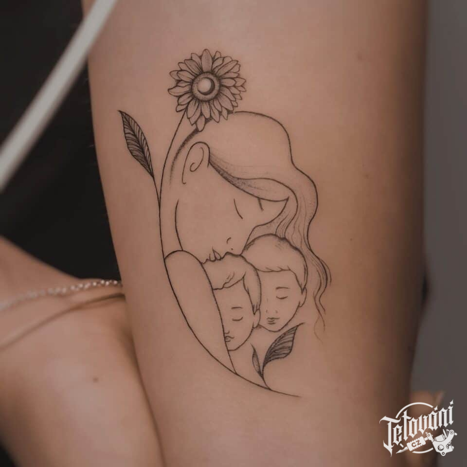 Tetování květina, žena s dětmi na předloktí
