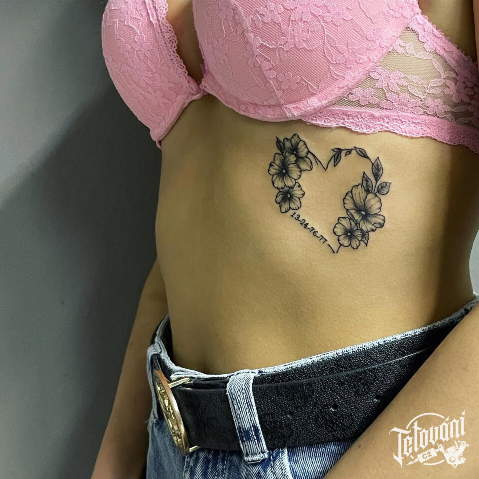 Tetování květinové srdce s čísly na žebrech