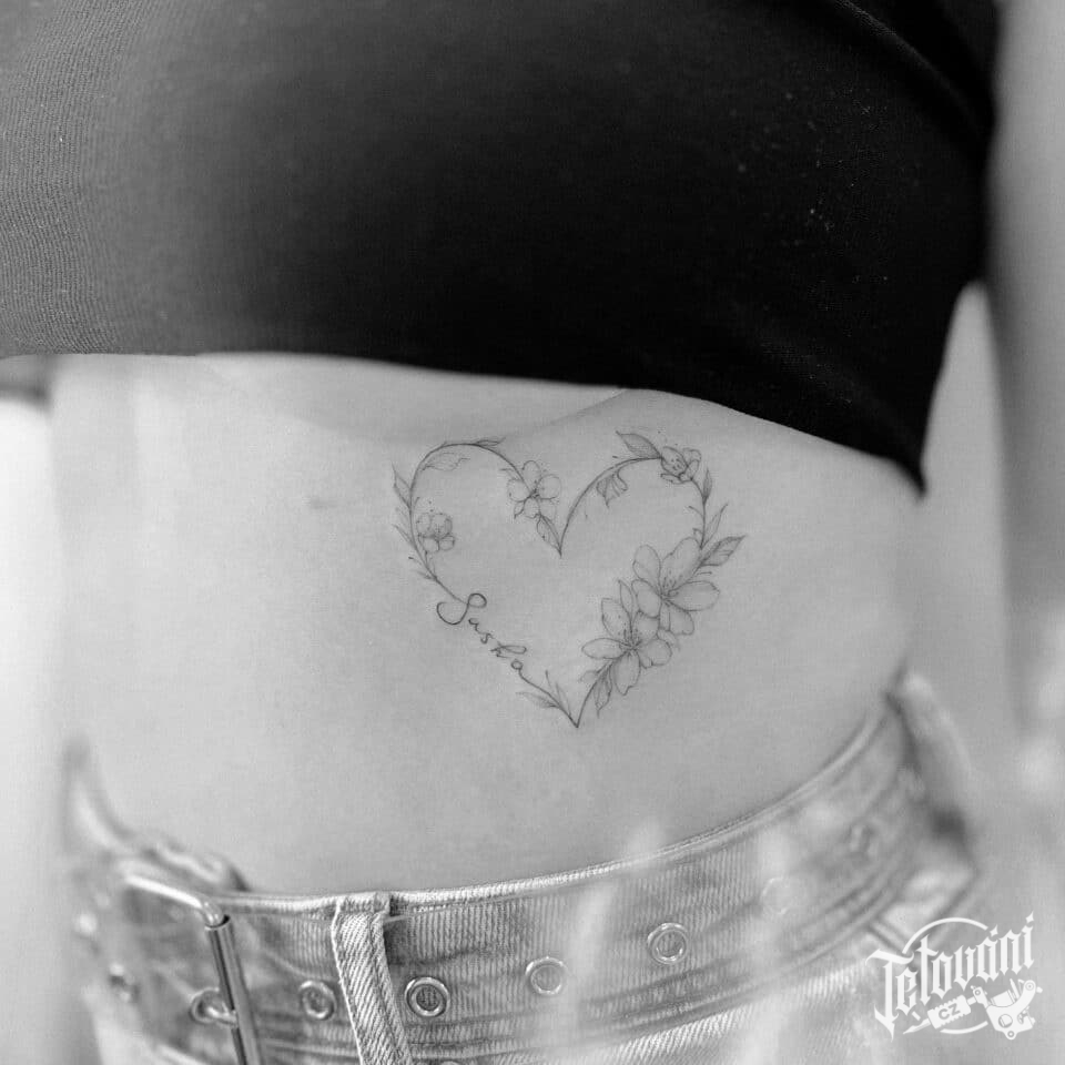Tetování květinové srdce se jménem na žebrech