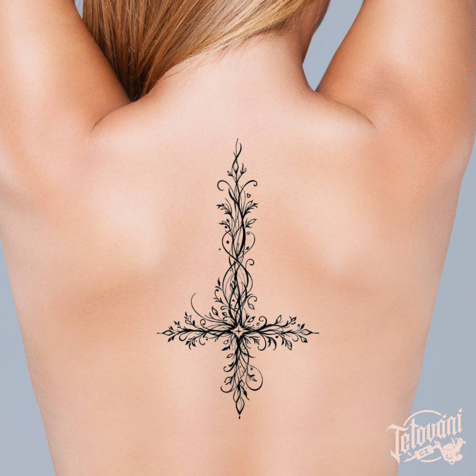 Tetování květinový obrácený kříž na zádech