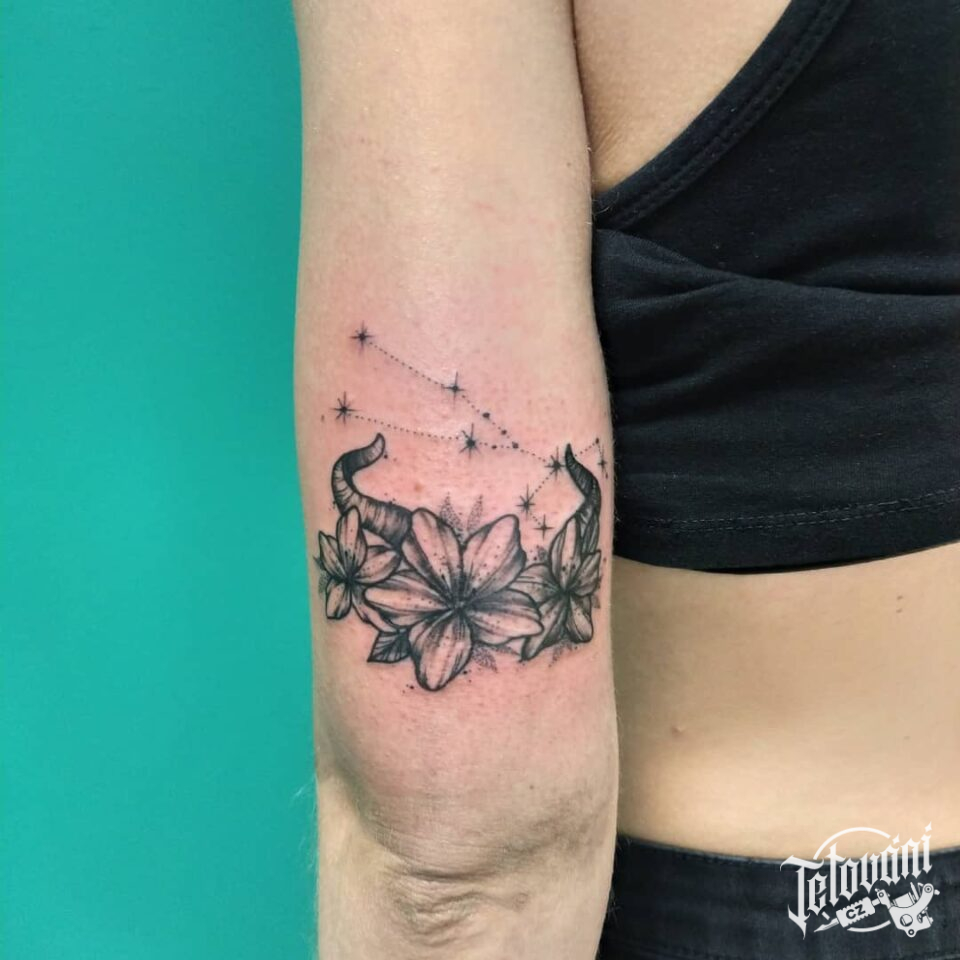 Tetování květiny a býk znamení zvěrokruhu na paži