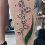 Tetování květiny a lebky místo květů na lýtko