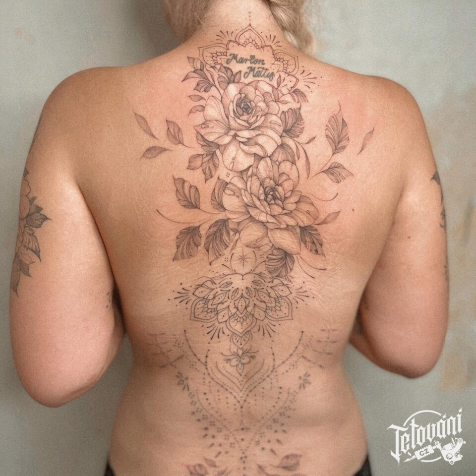 Tetování květiny a mandaly na zádech