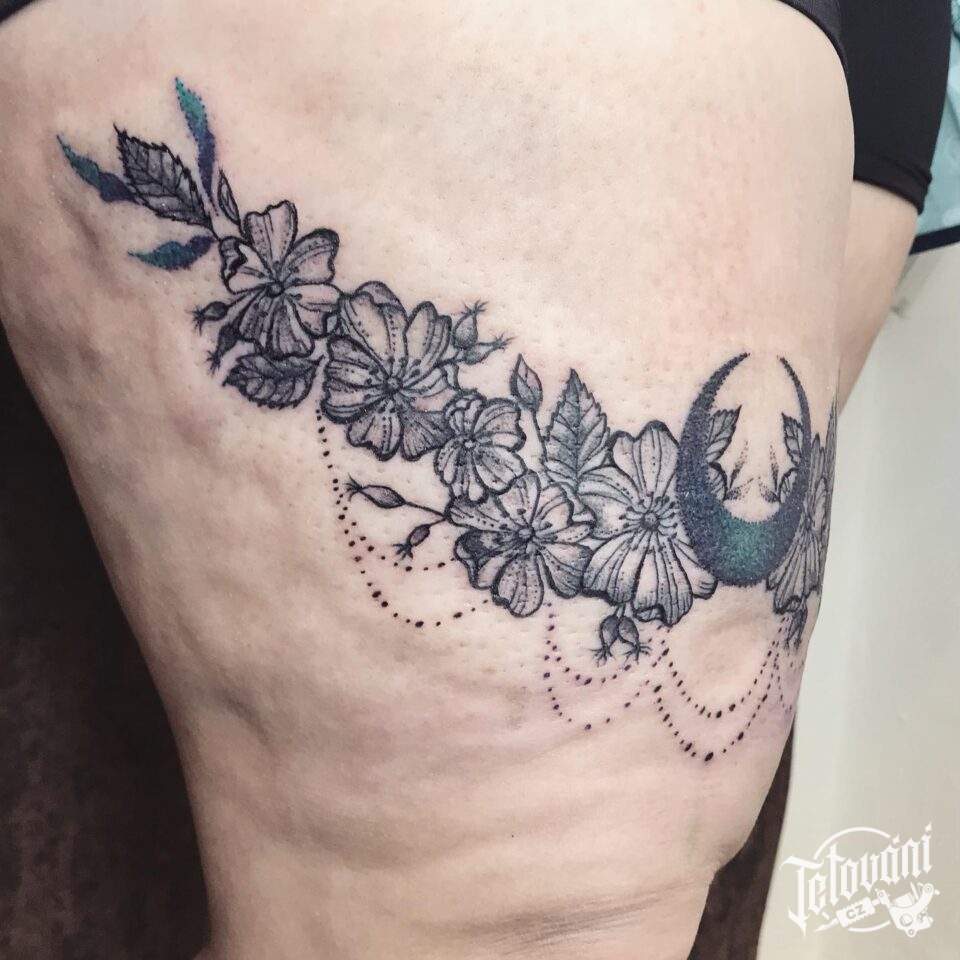 Tetování květiny a měsíc na stehno
