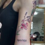 Tetování květiny a nápis na paži
