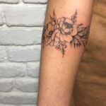 Tetování květiny a nápis na předloktí