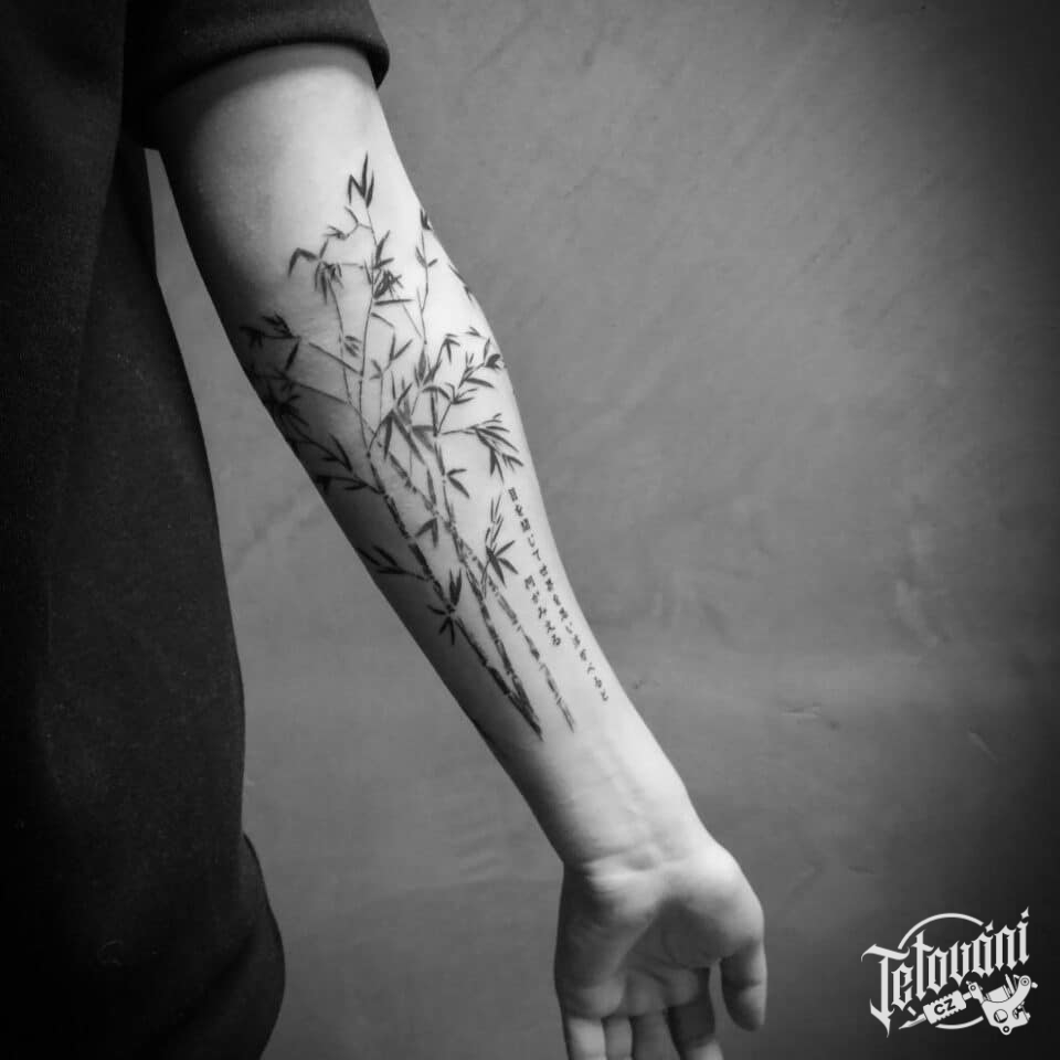 Tetování květiny a nápis na předloktí
