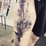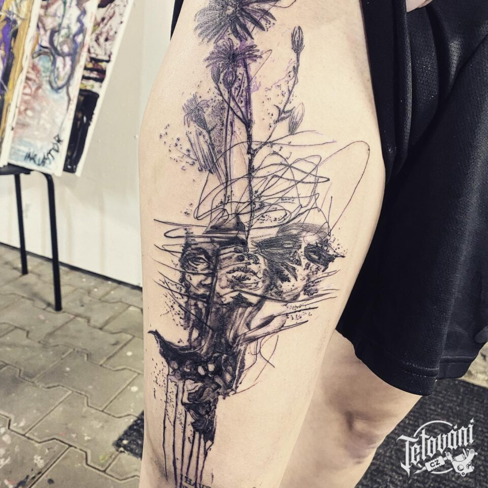 Tetování květiny a portréty na stehně