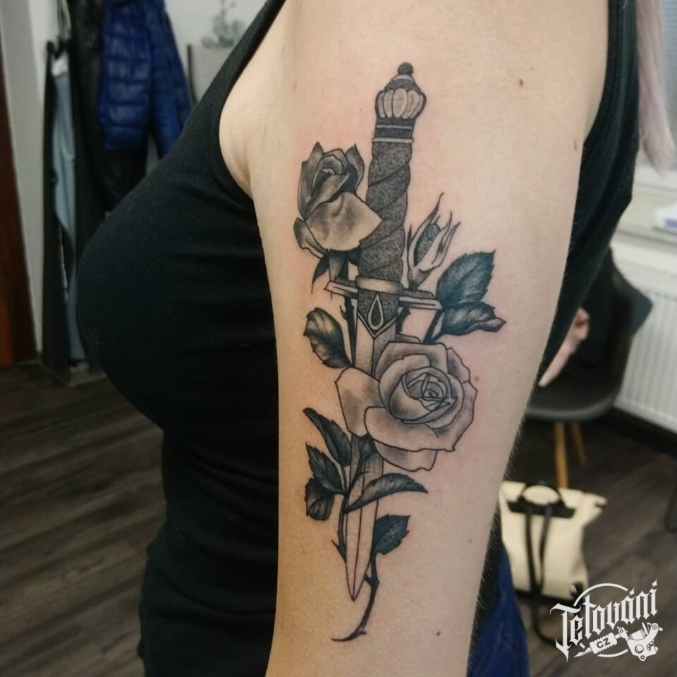 Tetování květiny a předmět, dýka a růže na uce