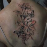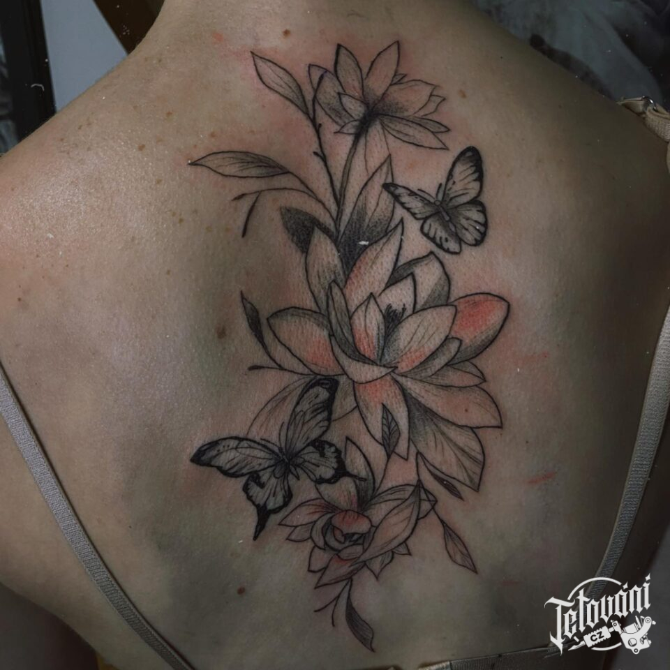 Tetování květiny a zvířata, lotos a motýlci na zádech