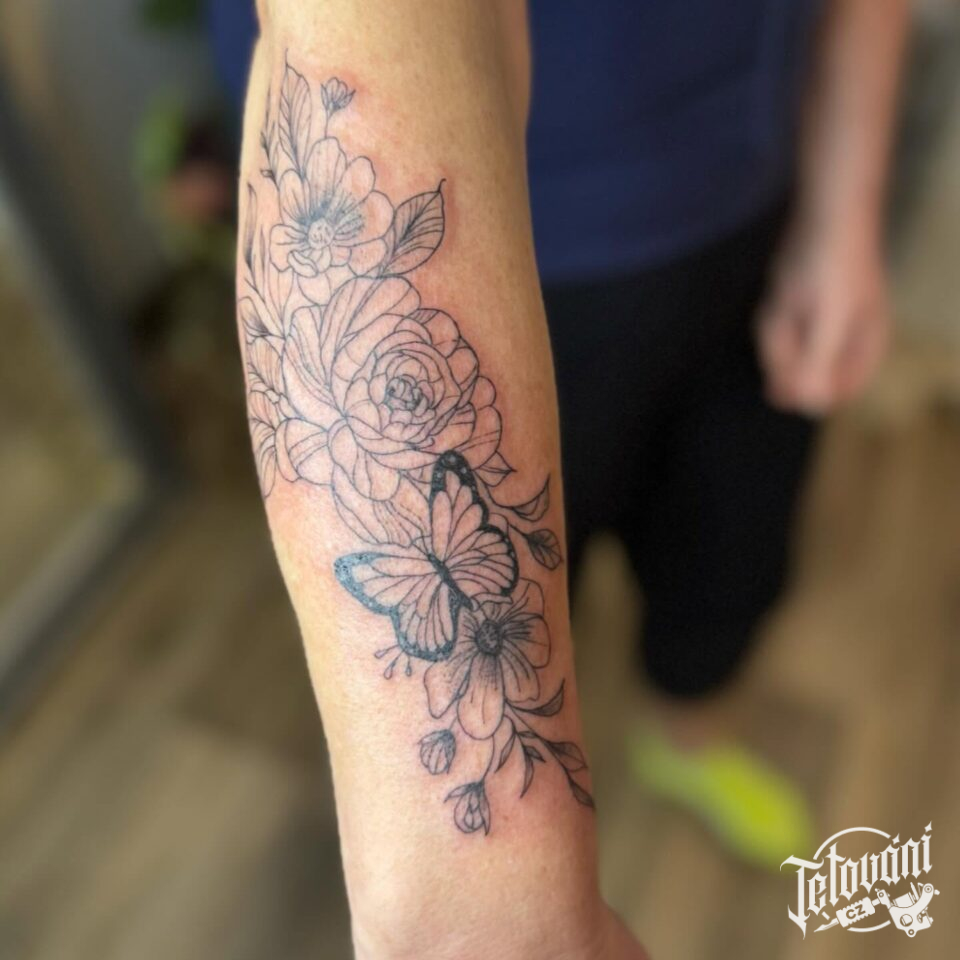 Tetování květiny a zvířata, motýl na předloktí