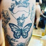 Tetování květiny a zvířata, motýli na boku stehna