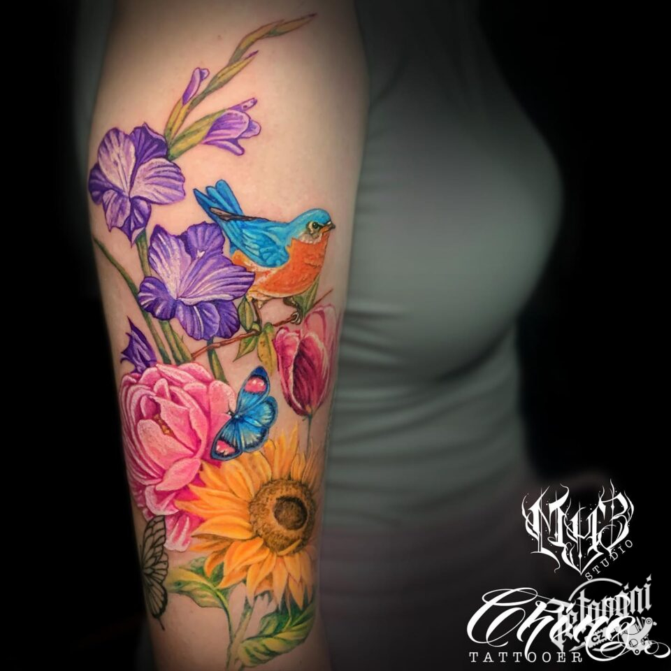 Tetování květiny a zvířata, ptáci na rameno