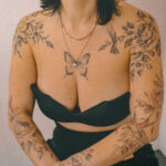 Tetování květiny a zvířata, pták, vlaštovka a motýl na hrudi