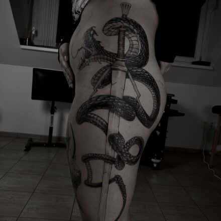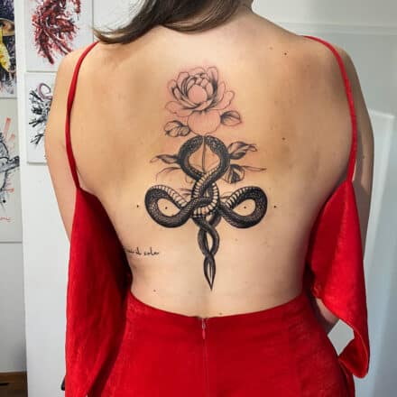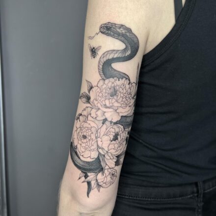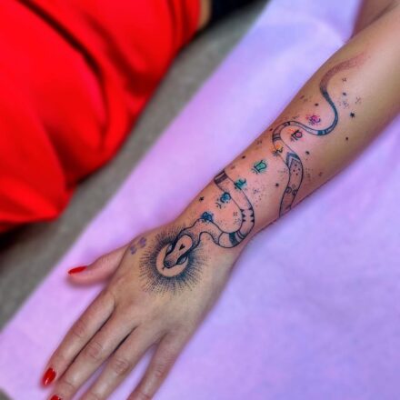 Tetování květiny a zvířata, had, vlčí mák, liška na předloktí