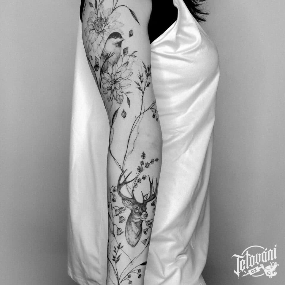 Tetování květiny a zvíře jelen, pták na ruku