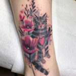Tetování květiny a zvíře, kočka a vlčí máky na noze