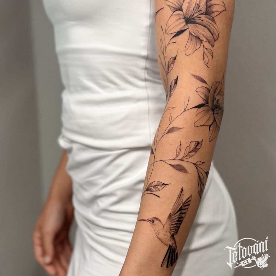 Tetování květiny a zvíře, lilie a kolibřík na ruce