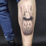 Tetování květiny a zvíře, luční kvítí a králík na holeni