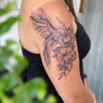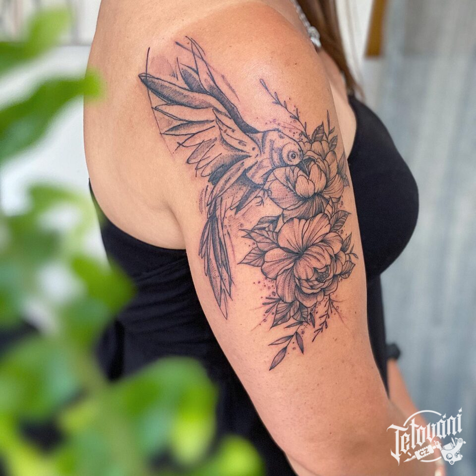 Tetování květiny a zvíře, pták na rameni