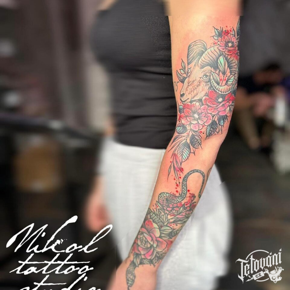 Tetování květiny, beran, had na paži